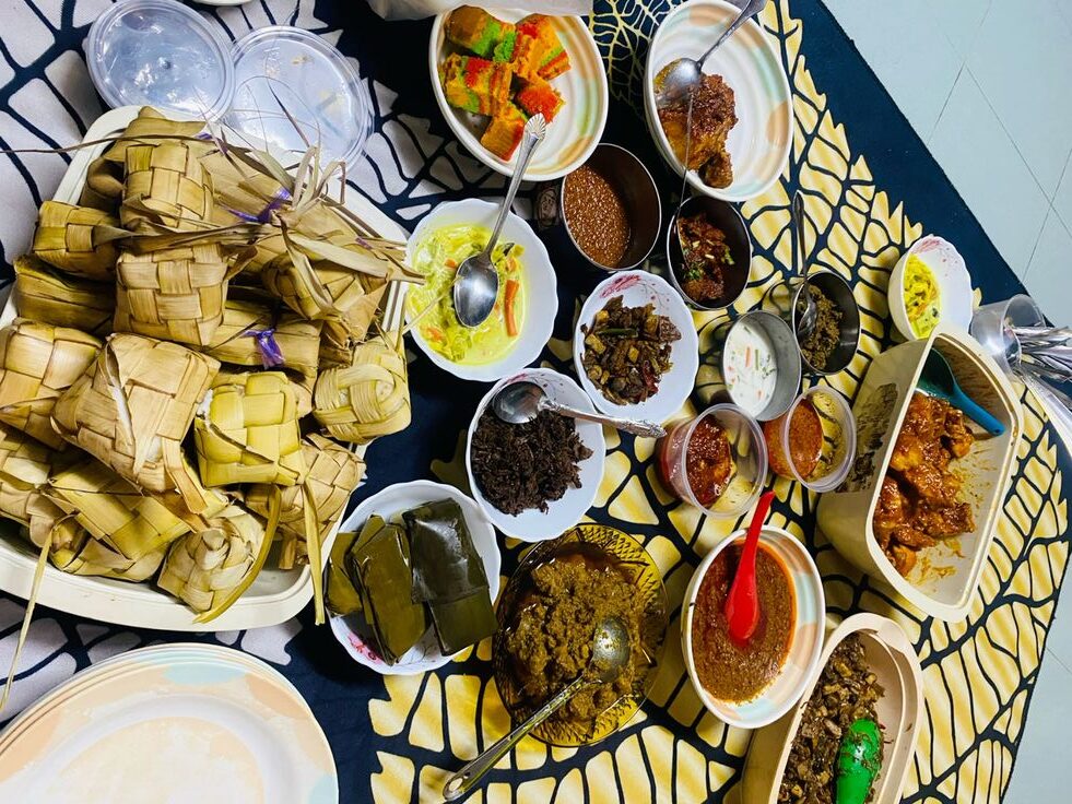 Suasananya penuh kehangatan, meja-meja dipenuhi makanan khas seperti lepat, kue talam, dan nasi minyak.