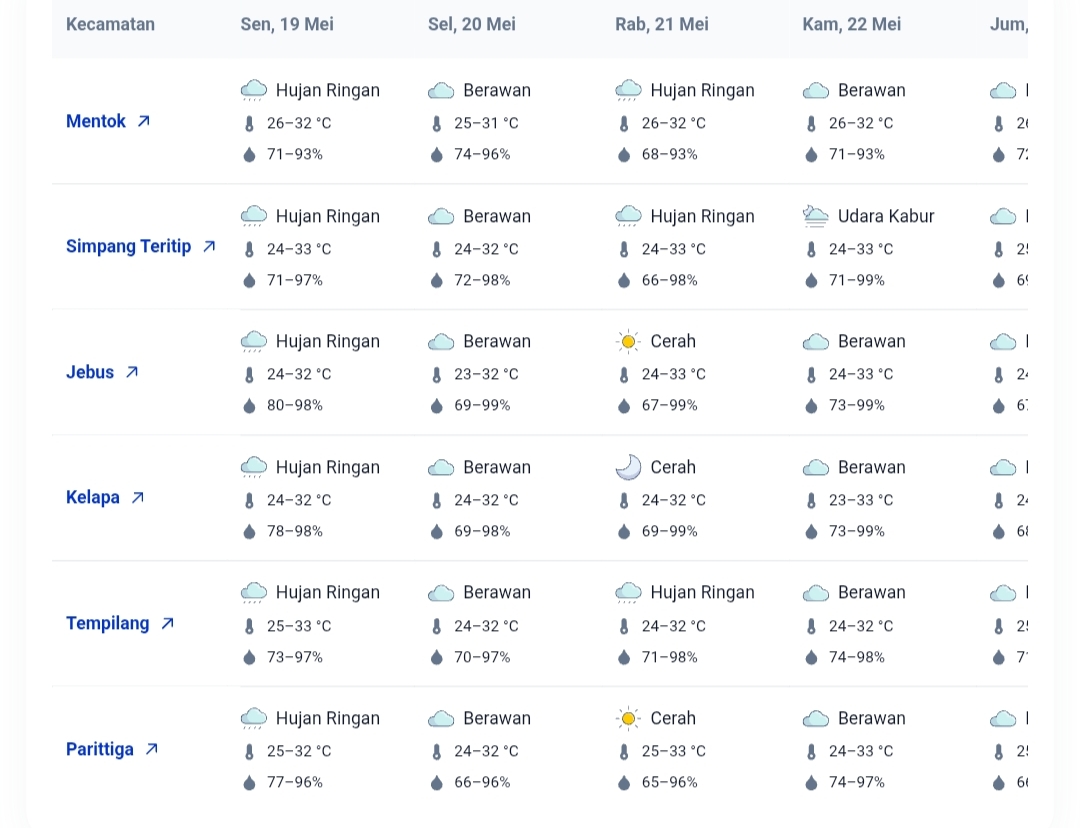 - Mentok: Berawan, suhu antara 26°C–30°C, kelembapan 75%–90%.