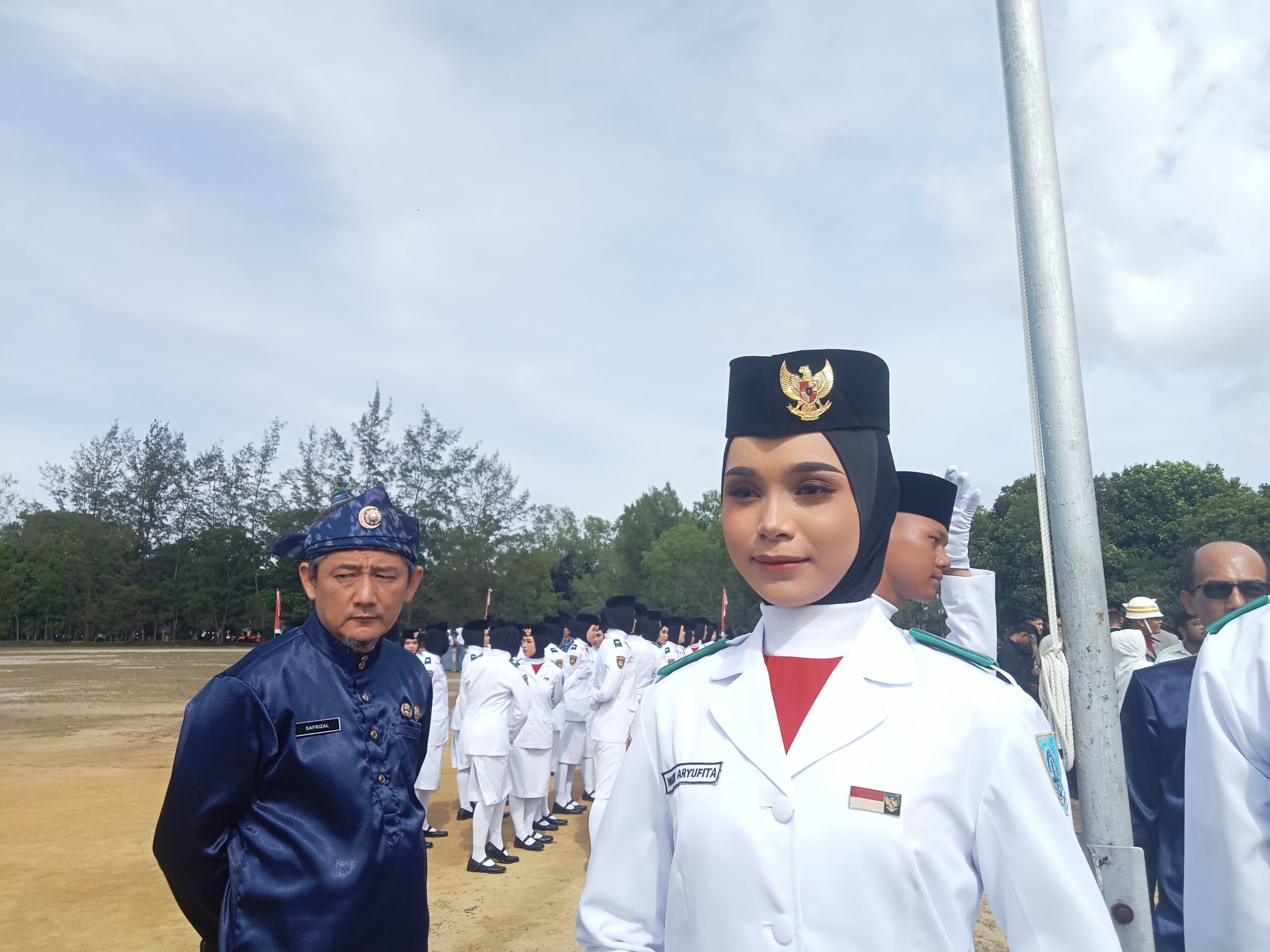 BANGKA BARAT,www.fokusbabel.com– Wajah Waode Aryufita tampak penuh percaya diri saat melangkah membawa baki bendera merah putih dalam upacara HUT ke-80 RI di Lapangan Atletik Pemda Bangka Barat, Minggu (17/8/2025).